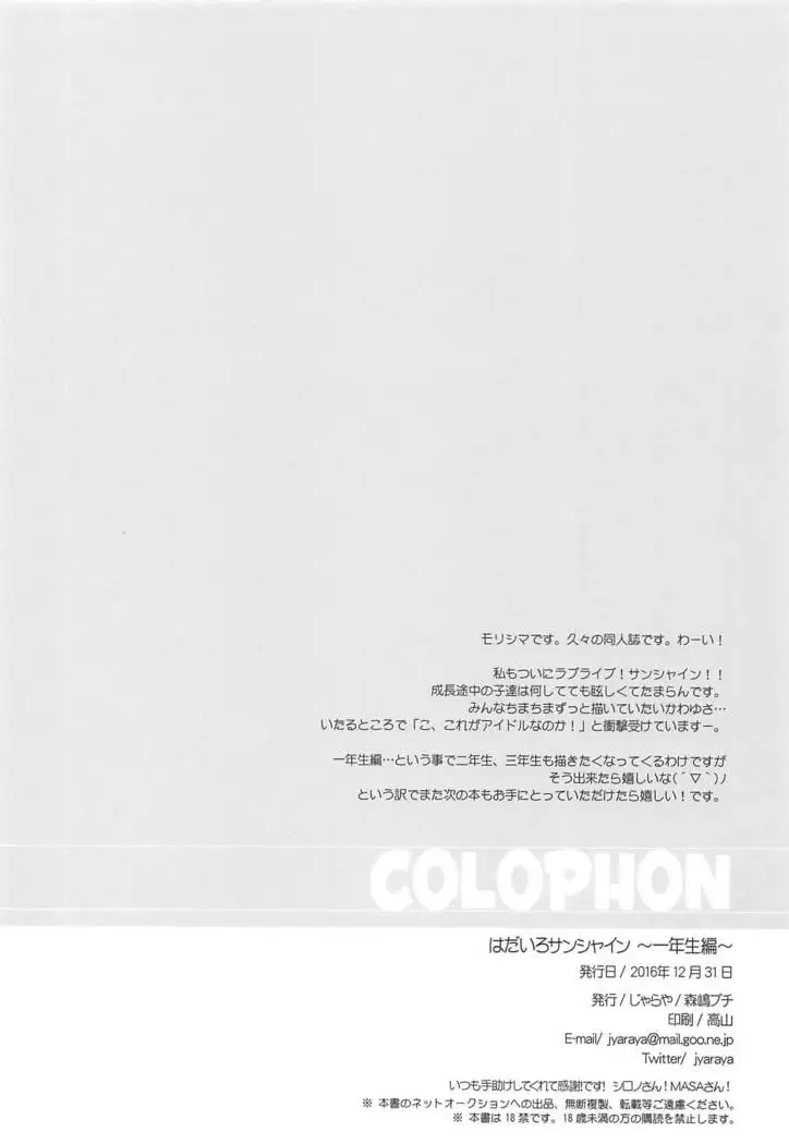 (C91) [Jyaraya (Morishima Petit)] Hadairo Sunshine ~Ichinensei Hen~ (Love Live! Sunshine!!)